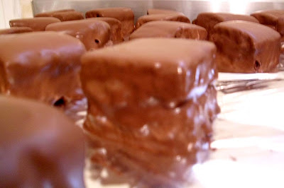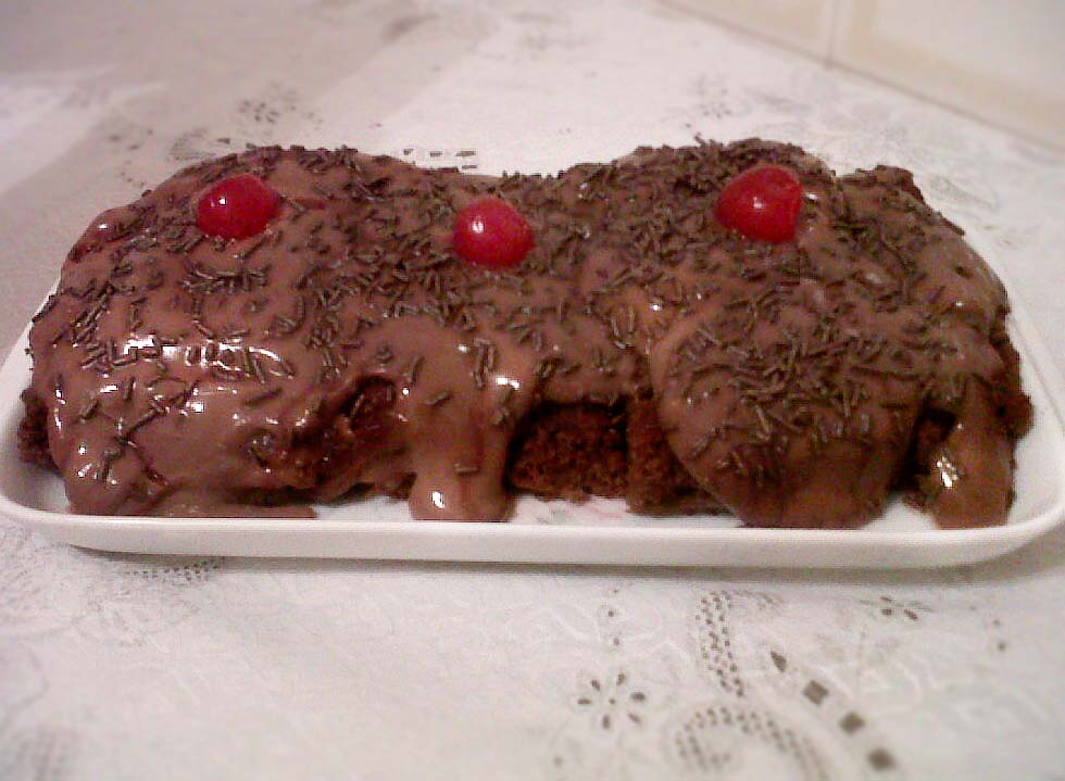 Desenforme e corte em quadrados. Parta ao meio e recheie com o doce escolhido. Cubra com chocolate ao leite ou meio amargo.
